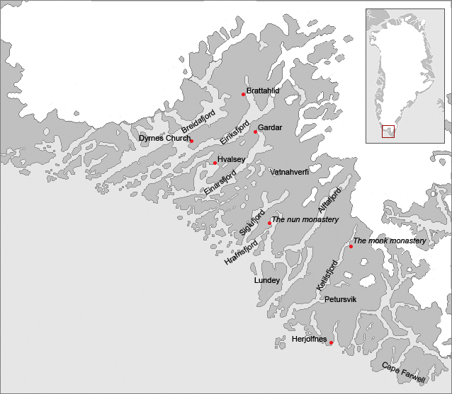 While he lived in Iceland Erik married Thjodhild Jorundsdottir, the daughter of Jorundur Ulfsson and Torbjorg “Ship-Breast” Gilsdottir. They had several children, including Leif Eriksson, Thorvald Eriksson, and Thorstein Eriksson. Erik’s daughter, Freydis Eriksdottir, may have been born of their union or by another woman. Leif was the only child buried at Brattahild. Thorvald was killed by natives in Vinland and buried there. His brother, Thorstein Eriksson, and his wife, Gudrid, set sail for Vinland to retrieve his brother’s body. The voyage was beset by storms and bad weather and they never reached Vinland. They turned back and were blown off course, landing in the Western Settlement 300 miles north of Brattahild. Thorstein perished that winter in an epidemic. Freydis Eriksdottir lived with her husband, Thorvald, in the community of Gardar (now Igaliku), about 10 miles away by boat from Brattahild (now Qassiarsuk). Gardar was the site of the first cathedral, built in 1126 CE, decades after Freydis had died. In 1944, when excavating the Gardar cathedral ruins, in an area that earlier housed a pre-Christian sacred area, archaeologists found the bodies of a man and woman. Some believe that they are the remains of Freydis and Thorvald. Under the same area are the skulls of 25 walrus and five narwhales. The sons of Erik the Red had accepted Christianity, but it is unclear if Freydis did.